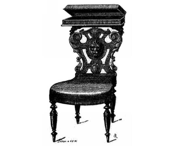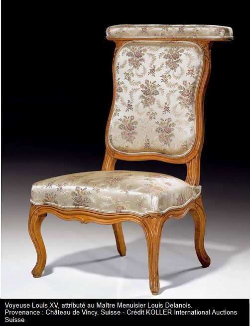 La voyeuse est une chaise étroite réservée aux hommes. Assis à califourchon sur l’assise en trapèze, on s’accoudait sur la manchette située au sommet du haut dossier sur lequel on appuyait sa poitrine.